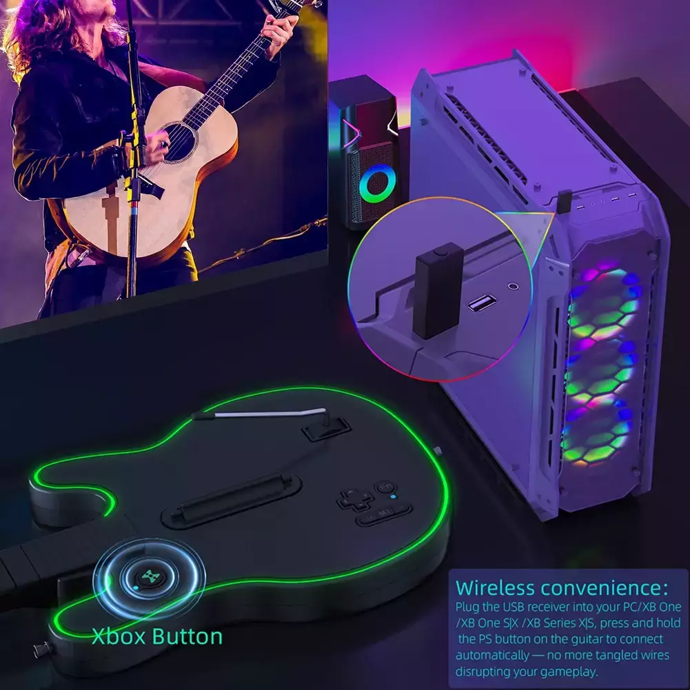 Palavras-chave: controlador de guitarra sem fio, Xbox Series X/S, controle para jogos musicais, acessório gamer, conexão 2.4G, gamepad sem fio, controlador para guitarra, equipamento para Xbox, controle ergonômico, bateria recarregável.