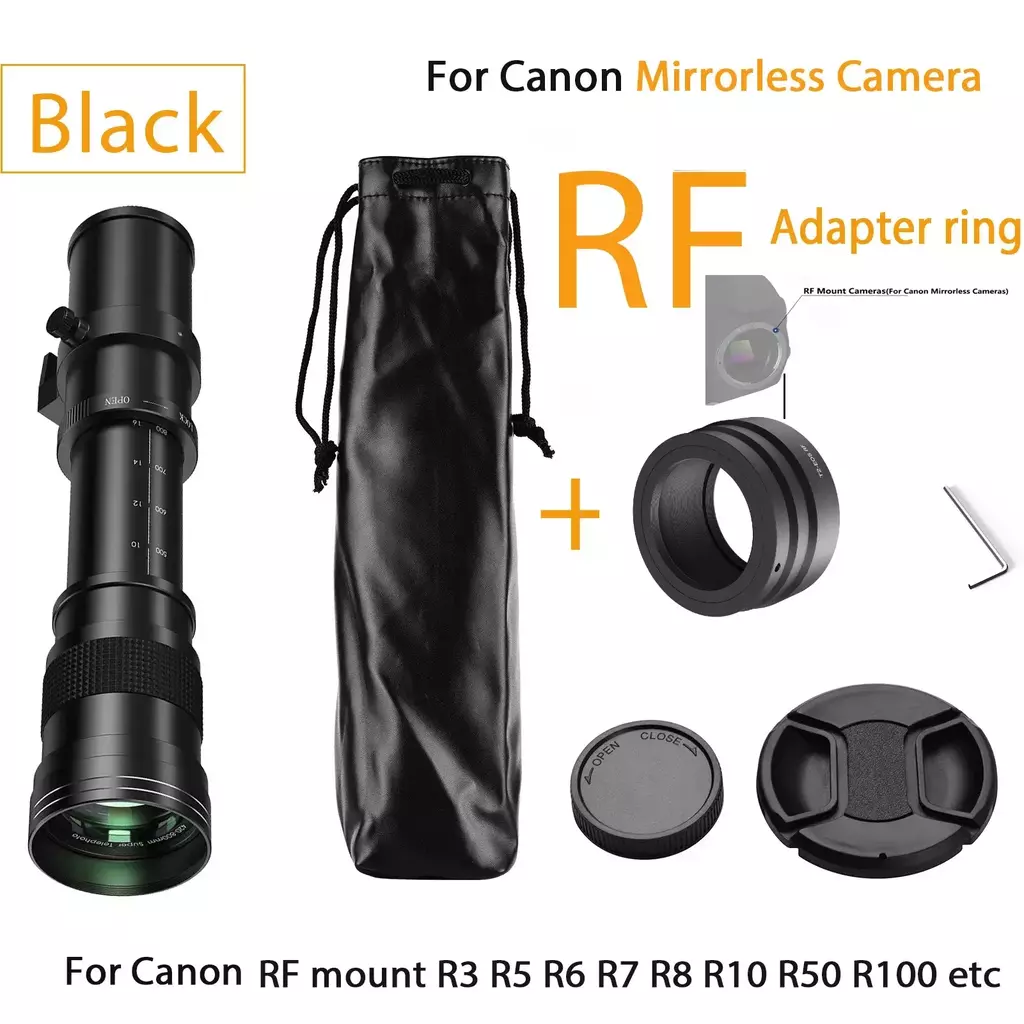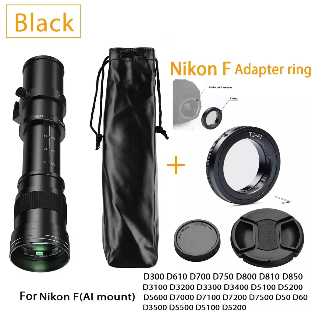 Construção Premium-Corpo todo em metal, resistente e prático. Vidro multi-revestimento de baixa dispersão, revestimento anti-reflexo, lente super telefoto com montagem em T, compatível com uma ampla gama de modelos de câmeras.